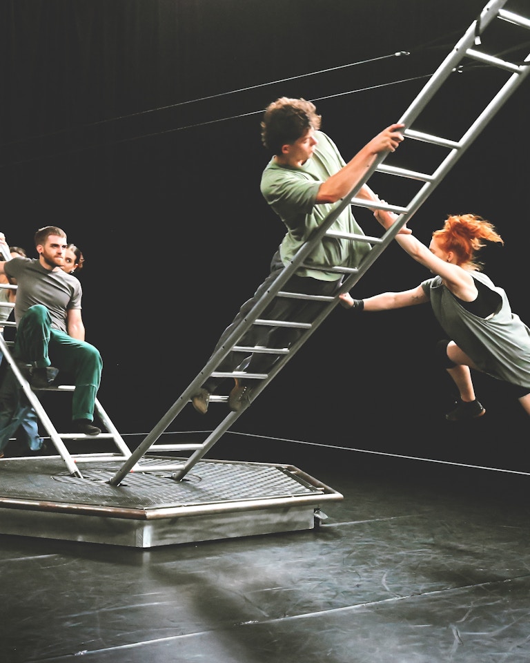 Ensemble, ils explorent leurs propres limites et celles de la collectivité, essayant de découvrir de manière ludique jusqu'où ils peuvent aller. La scénographie joue ici un rôle central : les escaliers deviennent des comprimarios fascinants, mais aussi un symbole fort de connexion. Beyond aborde ainsi un thème important et omniprésent : comment est-il possible de construire des ponts pour que les frontières disparaissent ?